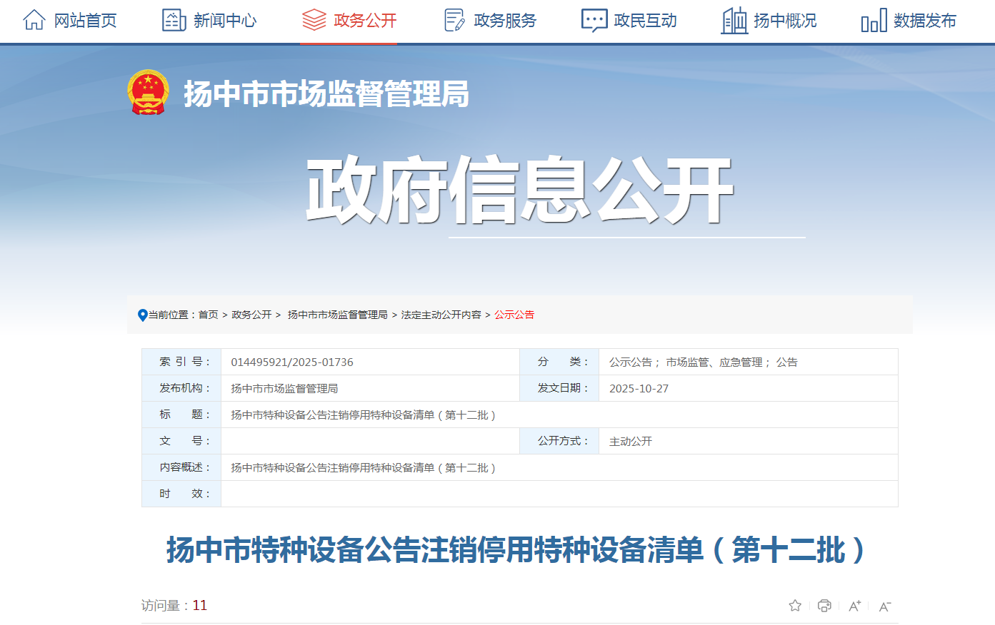 揚中市特種設(shè)備公告注銷停用特種設(shè)備清單(第十二批)